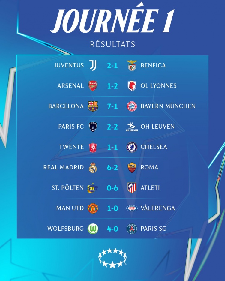 10月9日讯 女足欧冠职业联赛 阶段首轮赛事 战罢,巴萨7-1拜仁,阿森纳1-2里昂,苏超直播皇马6-2罗马,尤文、曼联皆取胜。