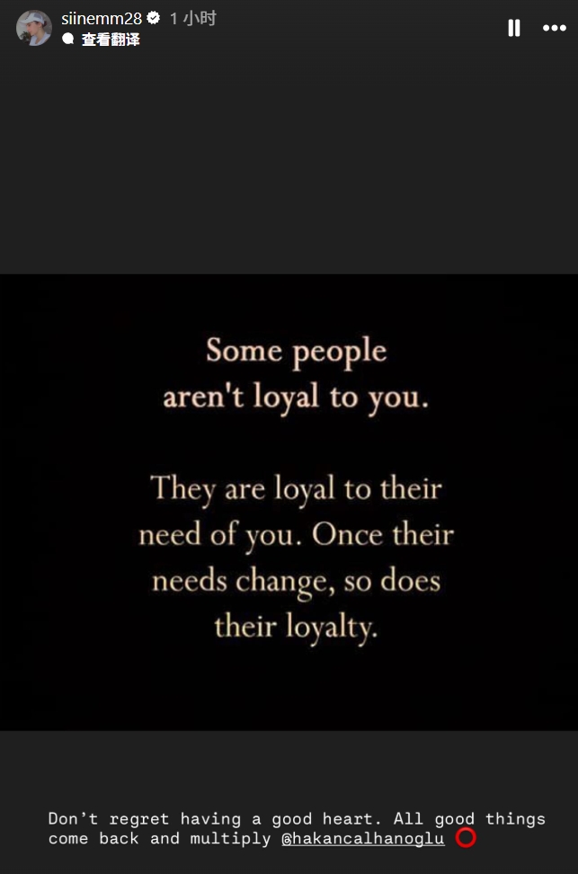 恰尔汗奥卢的妻子sinem在社交媒体上发文写道:“有些人并非忠诚于你,今天苏超直播而是忠诚于他们对你的需求,一旦需求改变,他们的忠诚也随之消失。