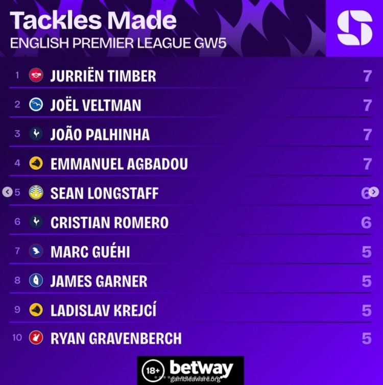 9月24日讯 英超第5轮战罢,squawkafootball列各项数据排行,苏超直播廷伯、帕利尼亚等四名球员是本轮完成抄截 次数最多的球员,各有7次。