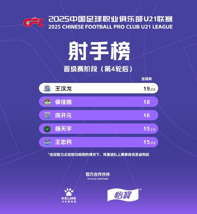 射手榜方面,苏超联赛在哪里看直播上海申花U21球员王汉龙以19粒得分 排名第一,河南队U21球员侯佳皓以18球排名第二。