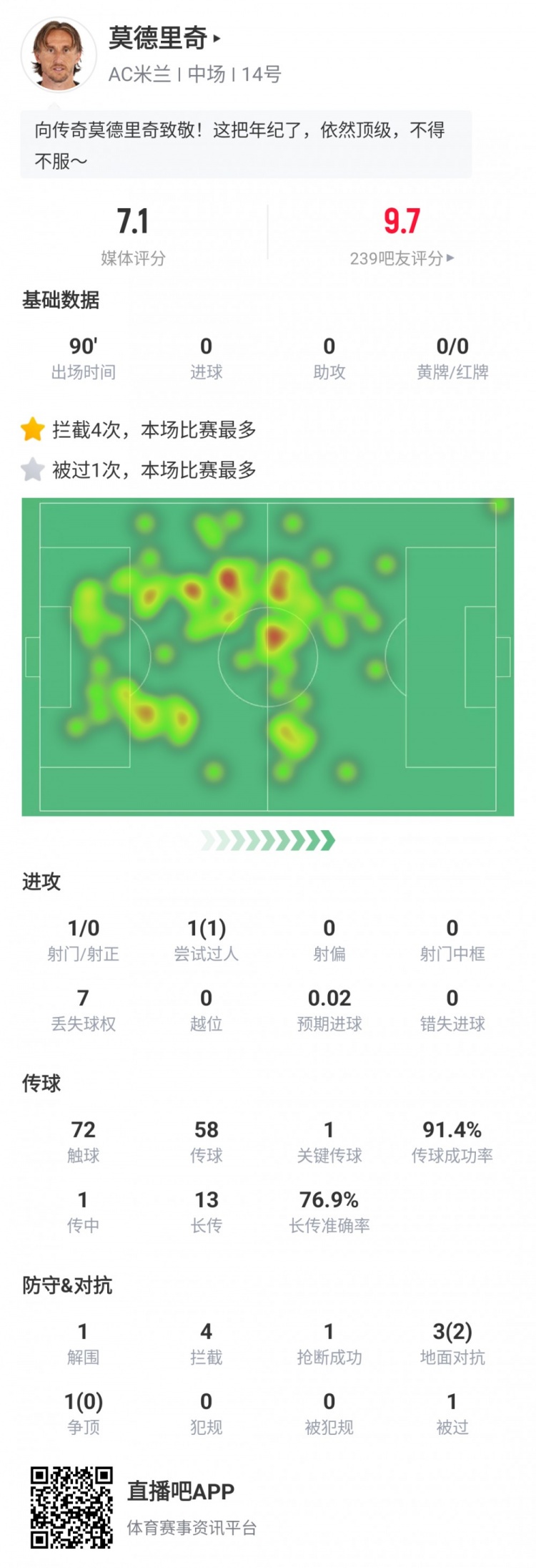 9月29日讯 米兰在本轮意甲2-1击败那不勒斯登顶,40岁的莫德里奇杆位并踢满90分钟,以下是他的个人数据。