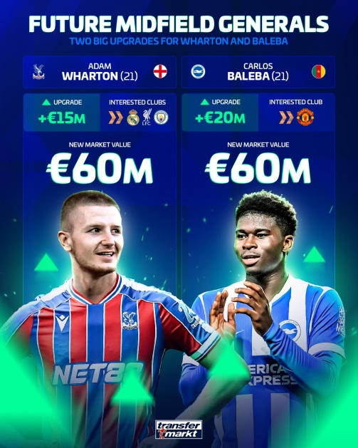 21岁后腰双子星!巴莱巴、沃顿身价一起暴涨,涨至6000万欧