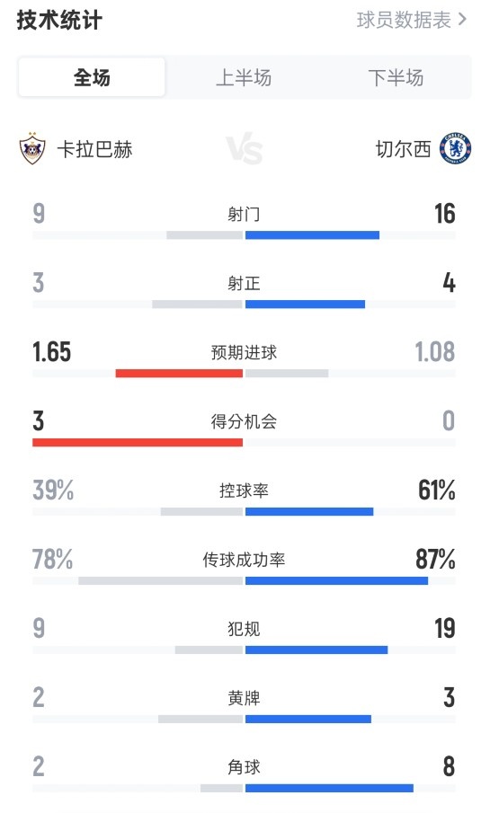 卡拉巴赫2-2切尔西全场数据:射球 9-16,射正3-4,盘带时间 39%-61%