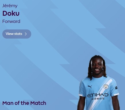 1得分 7过人成功,官方:多库当选曼城3-0利物浦一役全场最佳