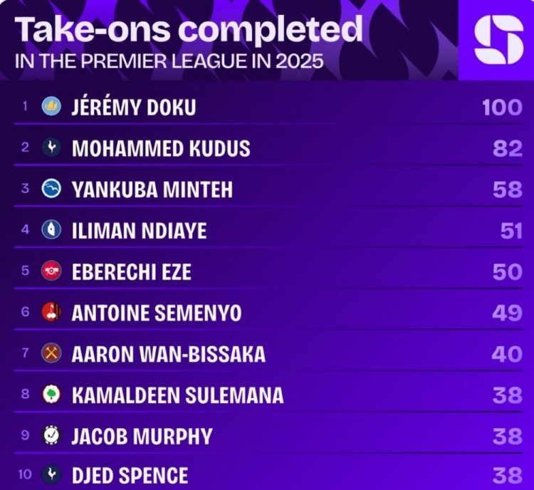 多库是今年首位英超成功过人100次的球员,领跑 第二名库杜斯18次