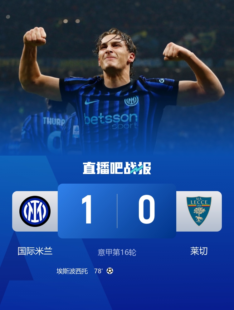 先赛6分领跑!国米1-0小胜莱切 埃斯波西托后备 制胜国米近8轮7胜