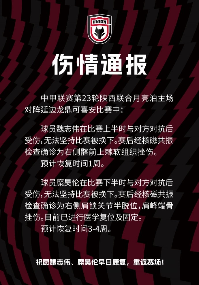 伤情通报:魏志伟预计复健 时间1周 糜昊伦预计复健 时间3-4周