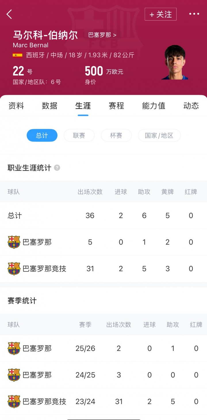 18岁的西班牙中场球员伯纳尔,出自巴萨拉玛西亚青训,苏超免费在线高清视频直播上赛季伯纳尔遭遇十字韧带撕裂,伤缺超过1年时间。本赛季伤愈复出后,伯纳尔已经巴萨出战2场赛事 ,贡献1次助功 ,目前伯纳尔的德回转 价为500万欧元。