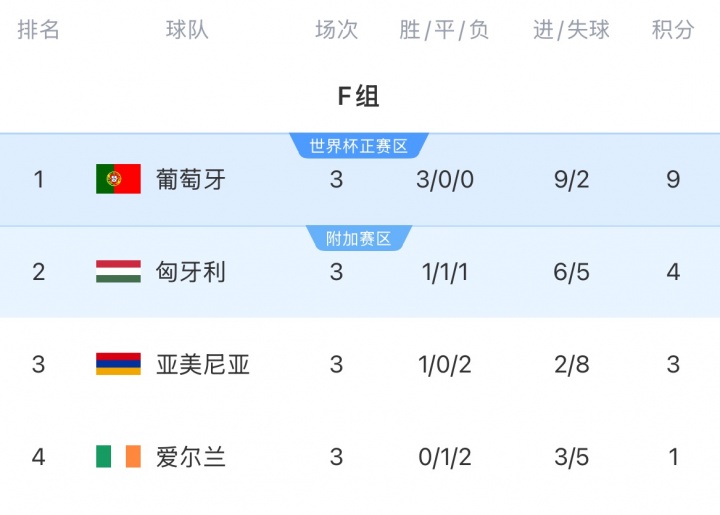 此外葡萄牙3轮全胜积9分领跑 匈牙利5分,今夜葡萄牙若击败匈牙利,且亚美尼亚不胜的话,葡萄牙即可提前锁定世界杯赛 席位。