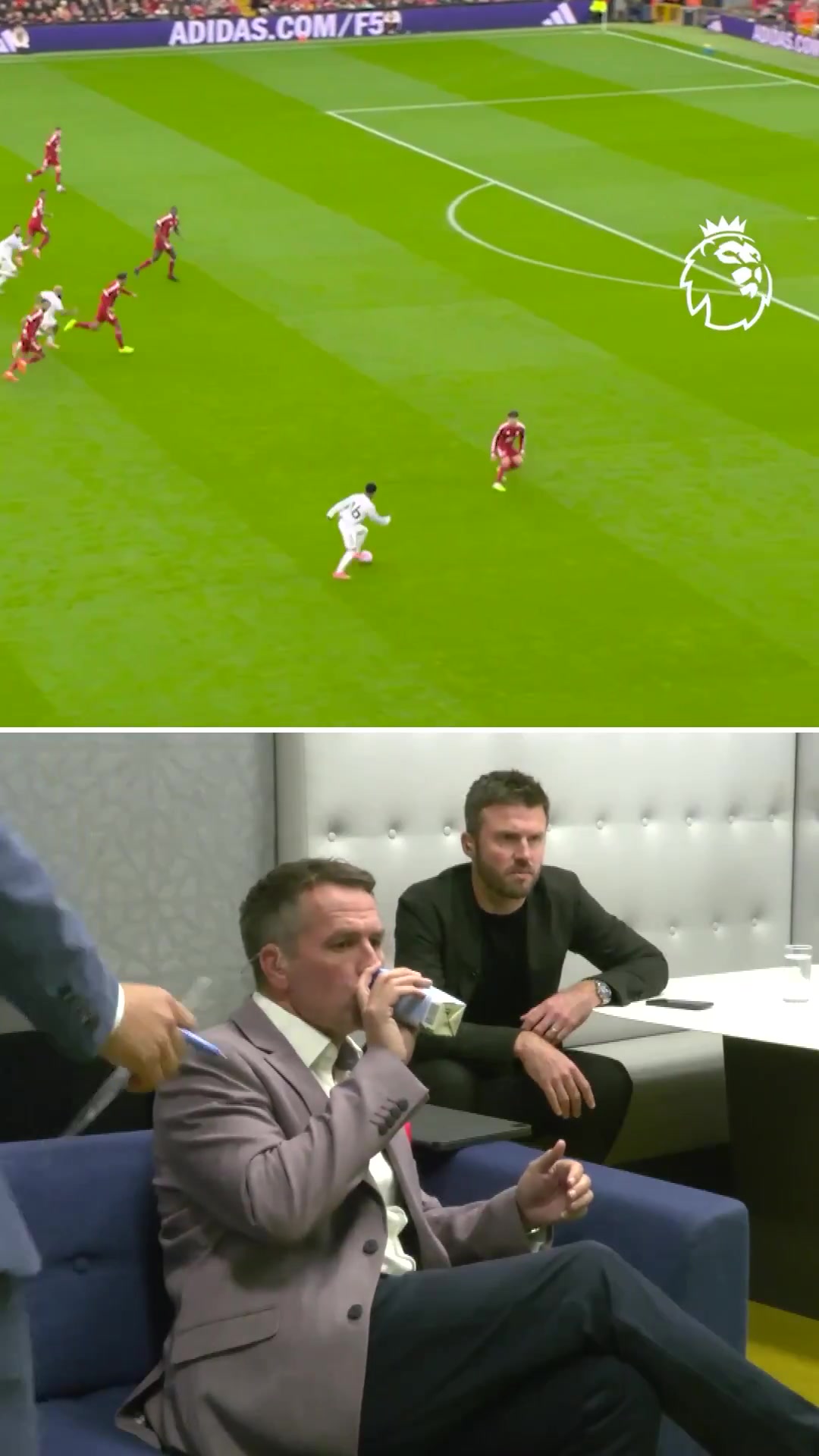 10月20日讯 本轮英超曼联客场应战 2-1击败利物浦,笑傲双红会,赛后英超官方发布了一段欧文和卡里克观看赛事 直播时的反应。